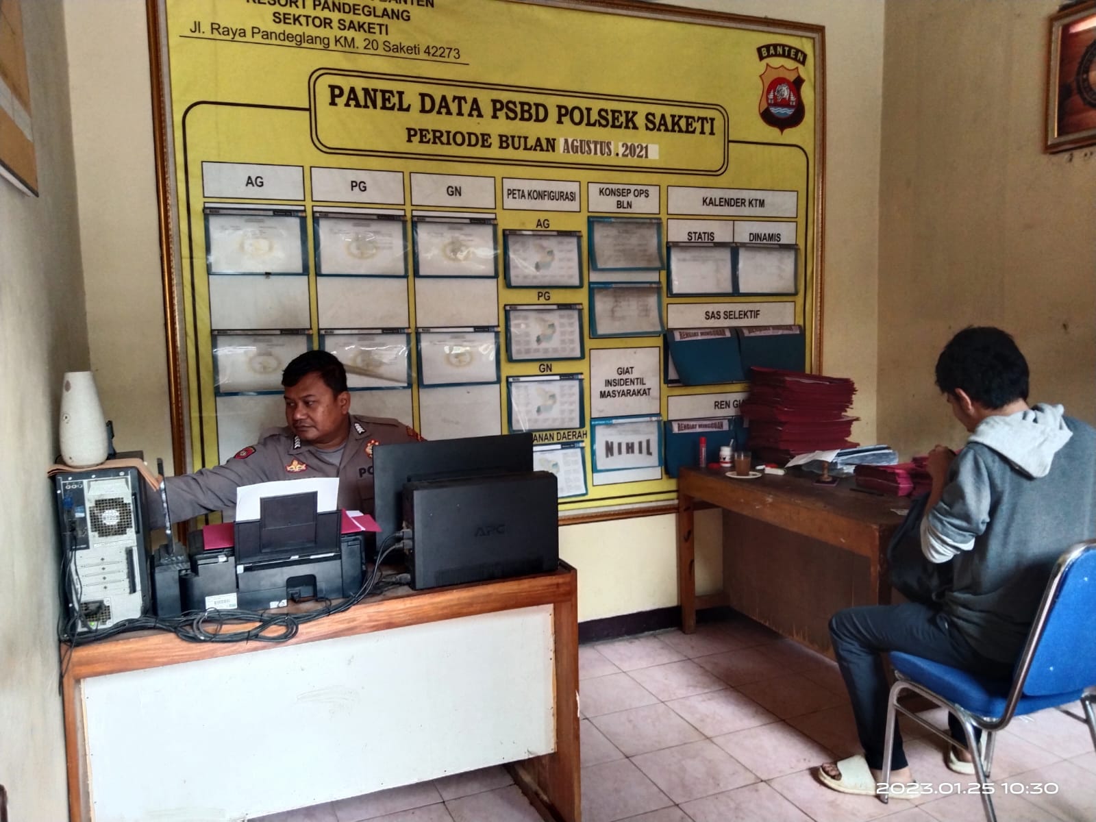 Hal itu terlihat dari sikap ramah dan profesional yang ditunjukkan oleh personel piket SPKT Polsek Saketi Bripka Jaenal Mustopa dalam melayani masyarakat yang datang ke SPKT.