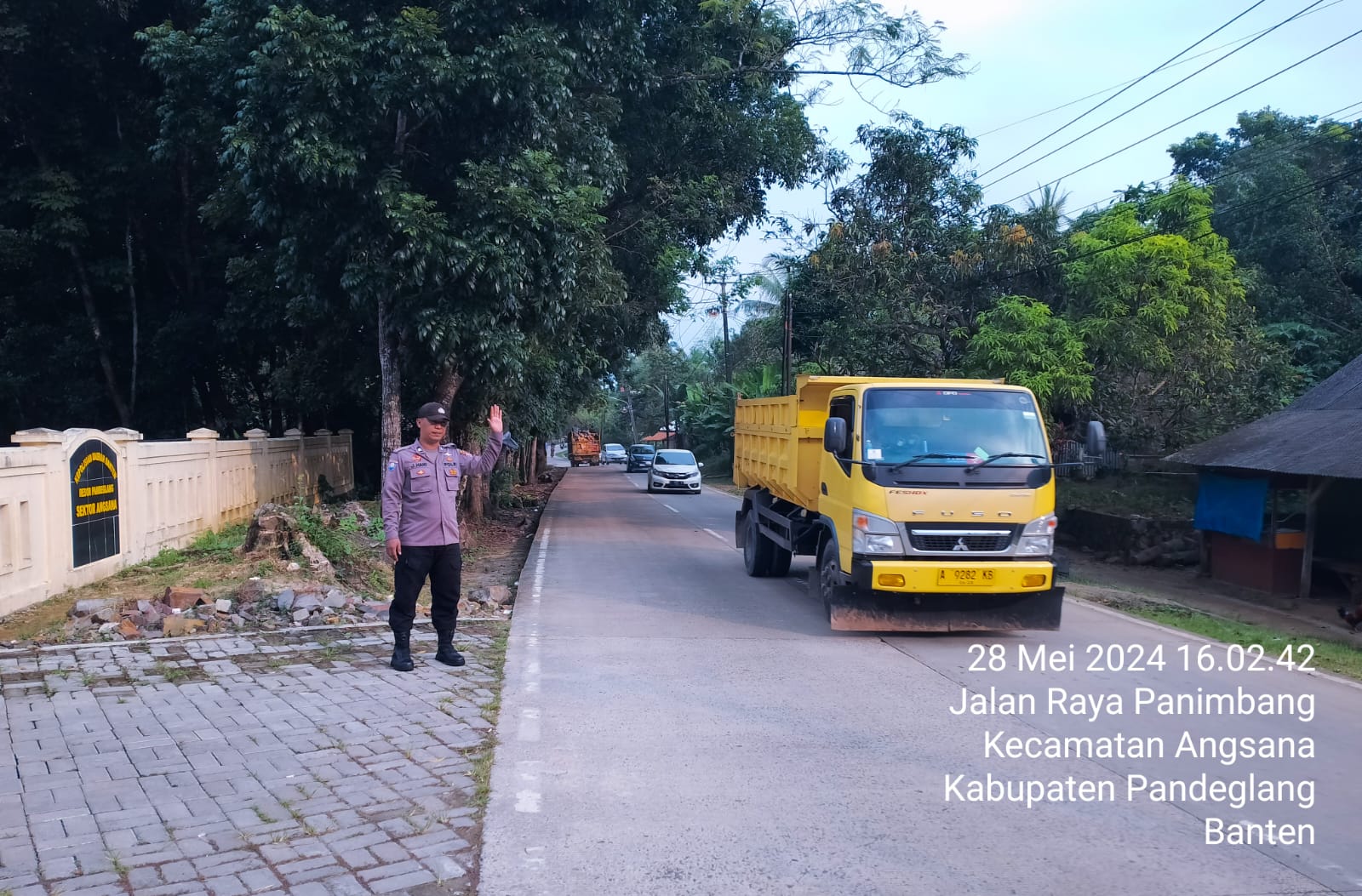 Pandeglang – Anggota Piket Polsek Angsana, Brigadir Jumhani, melaksanakan kegiatan strongpoint sore di Jl Raya Munjul Angsana pada Senin (28/5). Kegiatan ini bertujuan untuk memastikan kelancaran arus lalu lintas dan meningkatkan keamanan di wilayah tersebut saat jam-jam sibuk.