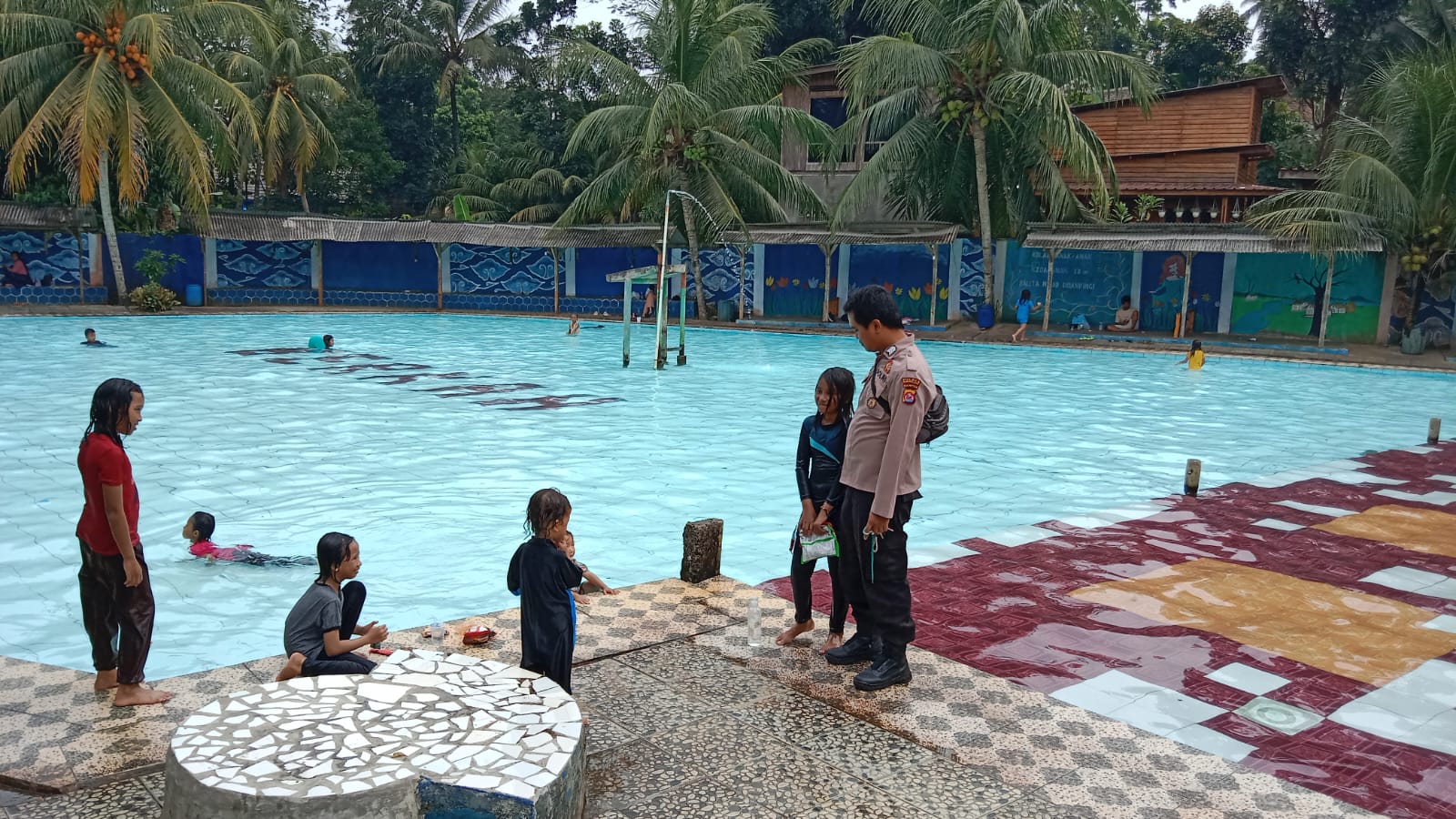 Pandeglang – Bripka Ahmad Khoerudin, anggota Polsek Menes, Polres Pandeglang, Polda Banten, melaksanakan patroli dialogis di tempat wisata kolam renang pada hari Sabtu, 1 Juni 2024. Patroli ini bertujuan untuk menjaga keamanan dan ketertiban masyarakat (Kamtibmas) di tempat wisata, serta mengedukasi para pengunjung tentang protokol kesehatan dan keselamatan berenang.
