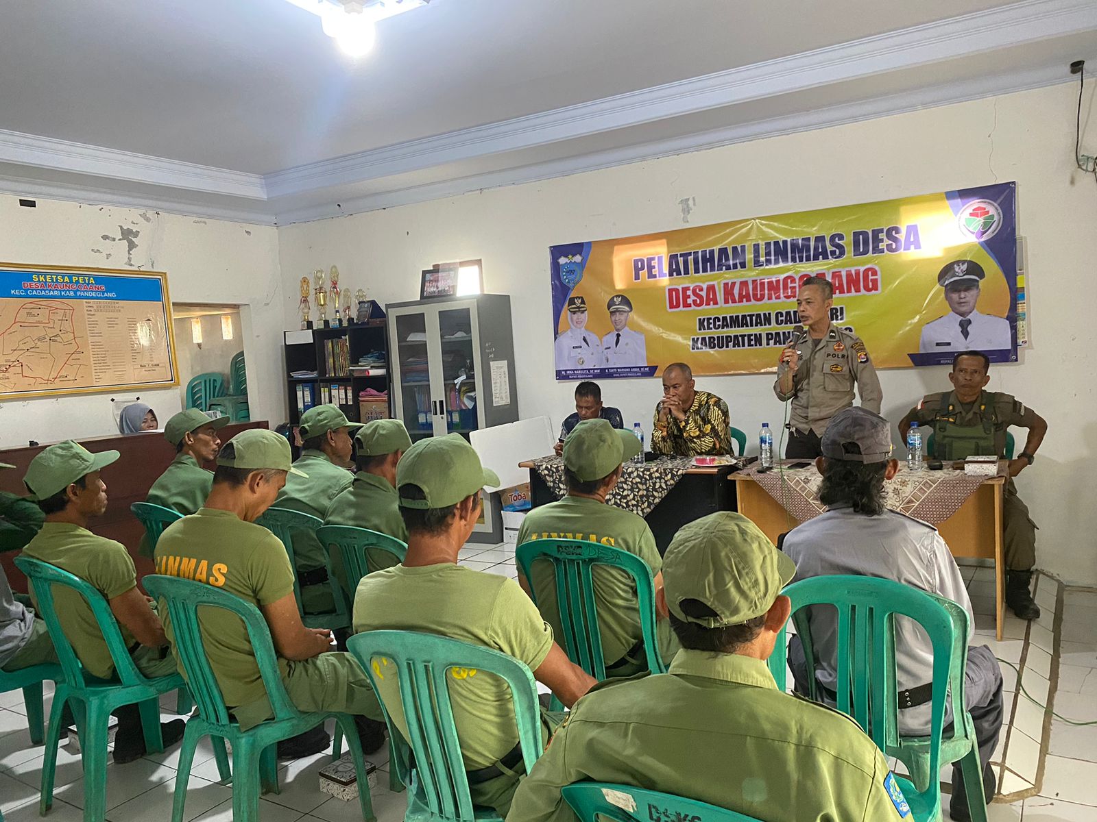 Pandeglang – Bhabinkamtibmas Polsek Cadasari Polres Pandeglang Desa Kaungcaang, Aipda Ibnu Haris, memberikan bimbingan teknis (bintek) kepada anggota Linmas Desa Kaungcaang (14/6).