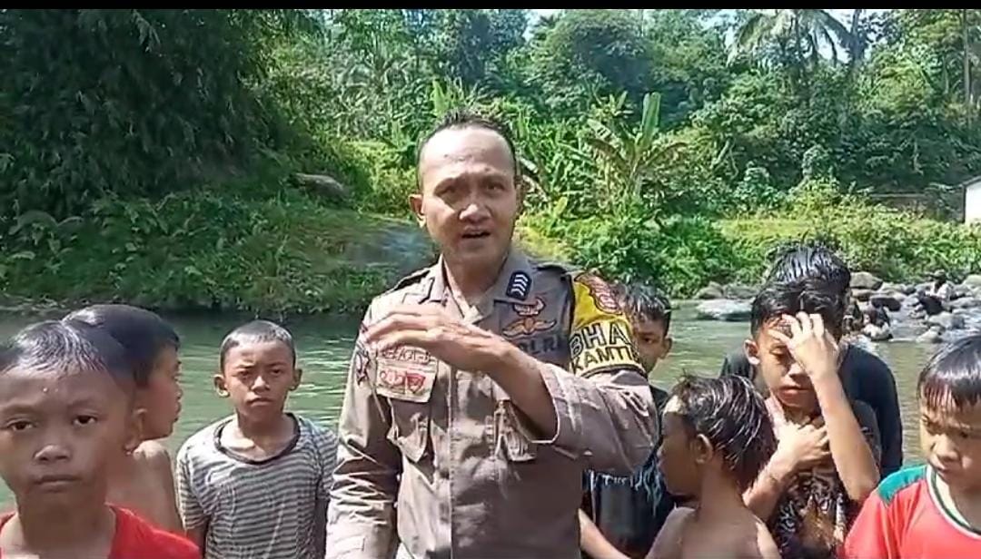 Bhabinkamtibmas Polsek Carita Ajari Anak-anak Desa Cinoyong Belajar Berenang di Musim Liburan