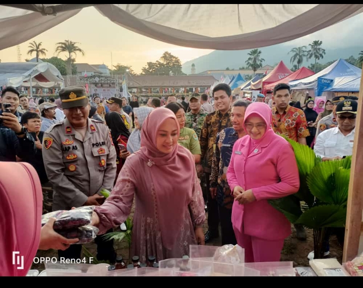 Bupati Pandeglang, Hj. IRNA NARULITA.,S.E.,M.M, turut mengunjungi stand bazar murah Polsek Pulosari. Beliau antusias melihat berbagai macam produk khas Pulosari yang ditawarkan.