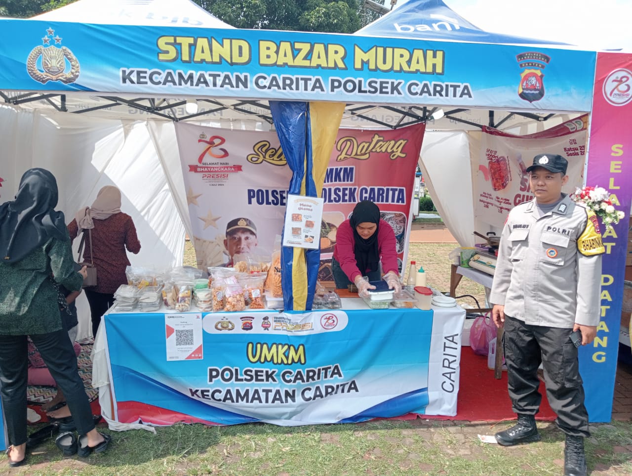 Pandeglang – Dalam rangka memperingati Hari Ulang Tahun (HUT) Bhayangkara ke-78 tahun 2024, personil Polsek Carita Polres Pandeglang beserta anggota Bhayangkari Ranting Carita turut aktif dalam mendukung kegiatan bazar UMKM yang diselenggarakan di Alun-Alun Pandeglang.
