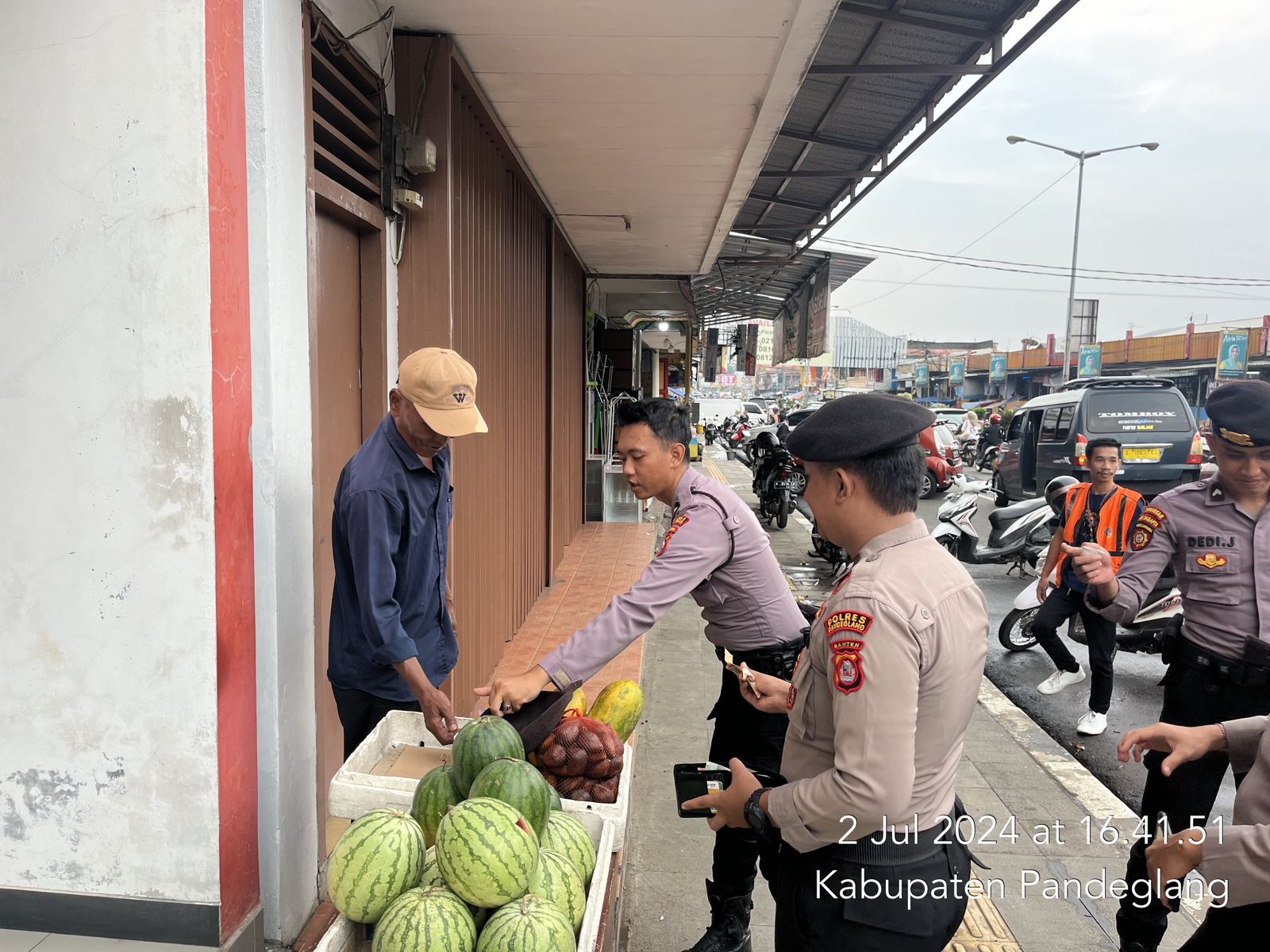 Pandeglang – Dalam rangka menjaga keamanan dan ketertiban masyarakat, personil Sat Samapta Polres Pandeglang melaksanakan patroli siang hari pada Selasa, 02 Juli 2024. Selama patroli, personil Sat Samapta menyambangi pedagang buah yang berjualan di wilayah hukum Polres Pandeglang dan memberikan himbauan kamtibmas.
