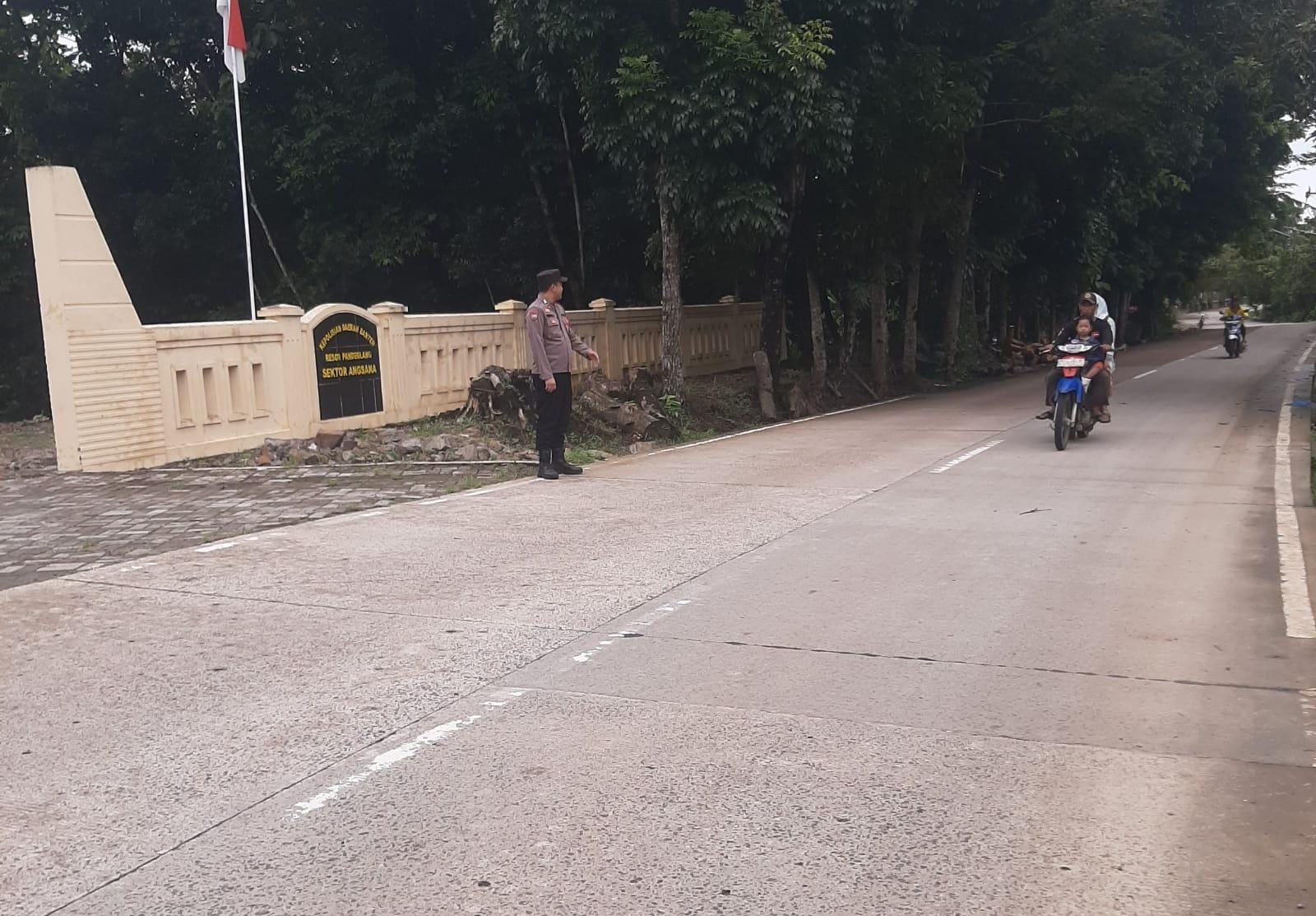 Berikan Pelayanan Kepada Masyarakat, Anggota Piket Polsek Angsana Polres Pandeglang Bripka Hendra Laksanakan Gatur Lalin di Jl Raya Munjul-Angsana