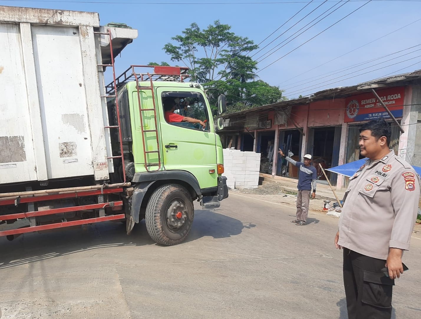 Bojong – Pada Selasa, 9 Juli 2024, personil Polsek Bojong Polres Pandeglang melaksanakan kegiatan pengaturan lalu lintas di persimpangan Pasar Bojong. Dalam kegiatan ini, Bripka Ranggawuni terlihat aktif memberikan pengaturan kepada truk yang sedang melintas, memastikan arus lalu lintas tetap lancar dan tertib.