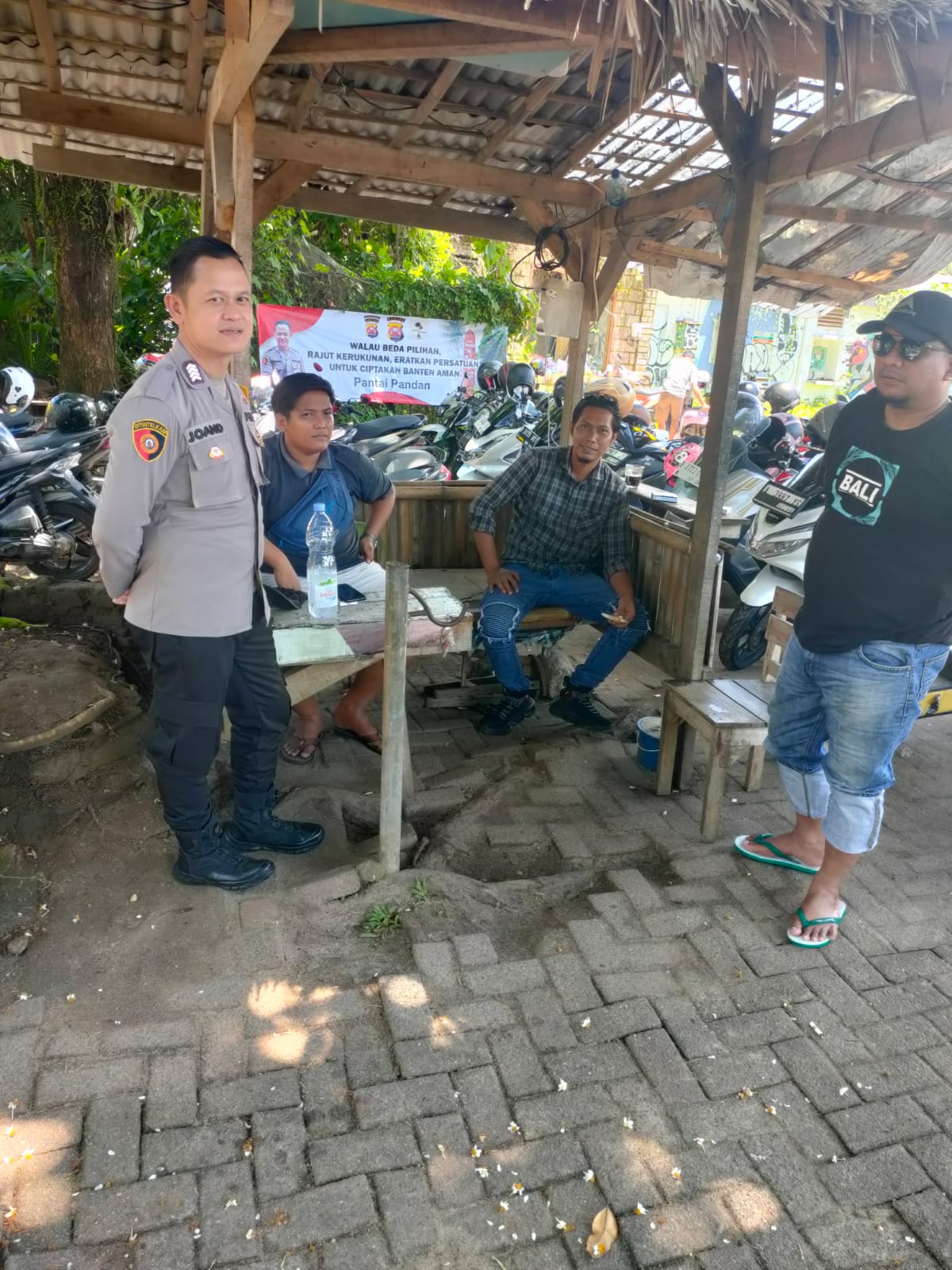 Bripka Yohan dari Polsek Carita Melaksanakan Patroli Siang dan Dialogis dengan Penjaga Parkir di Pantai Pandan Carita