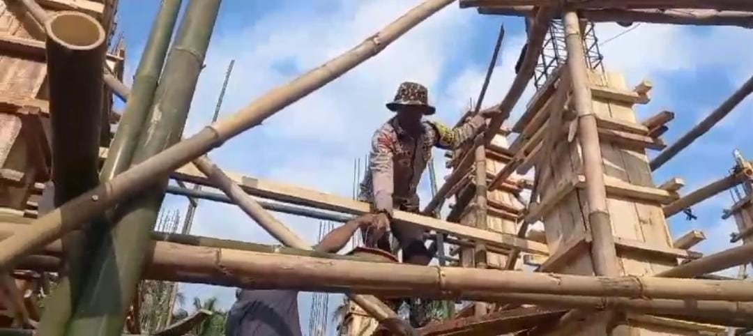 Personil Polsek Carita Bripka Sri Eka Bawantara Laksanakan Gotong Royong Membangun Masjid Al-Hidayah di KP. Gereuweuk Desa Pejamben