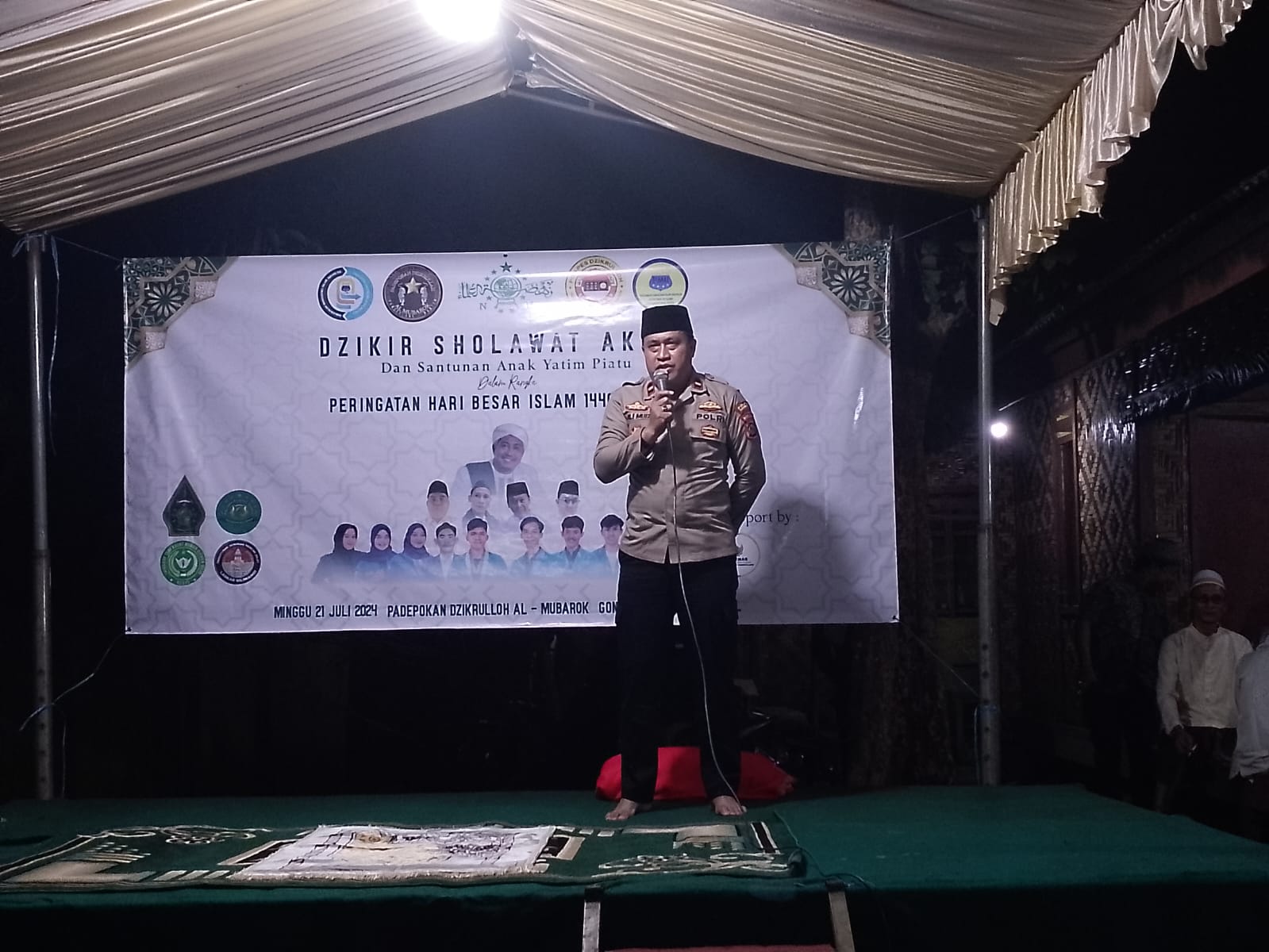 Cikedal – Dalam rangka memperingati Hari Besar Islam 1446 Hijriah, Kapolsek Cikedal Polres Pandeglang Ipda Ali Muiz Rusmana, S.H beserta Anggota, menghadiri kegiatan dzikir shalawat akbar dan santunan anak yatim piatu di Kampung Gonggong, Desa Cipicung, Kecamatan Cikedal, Minggu (21/7/2024).