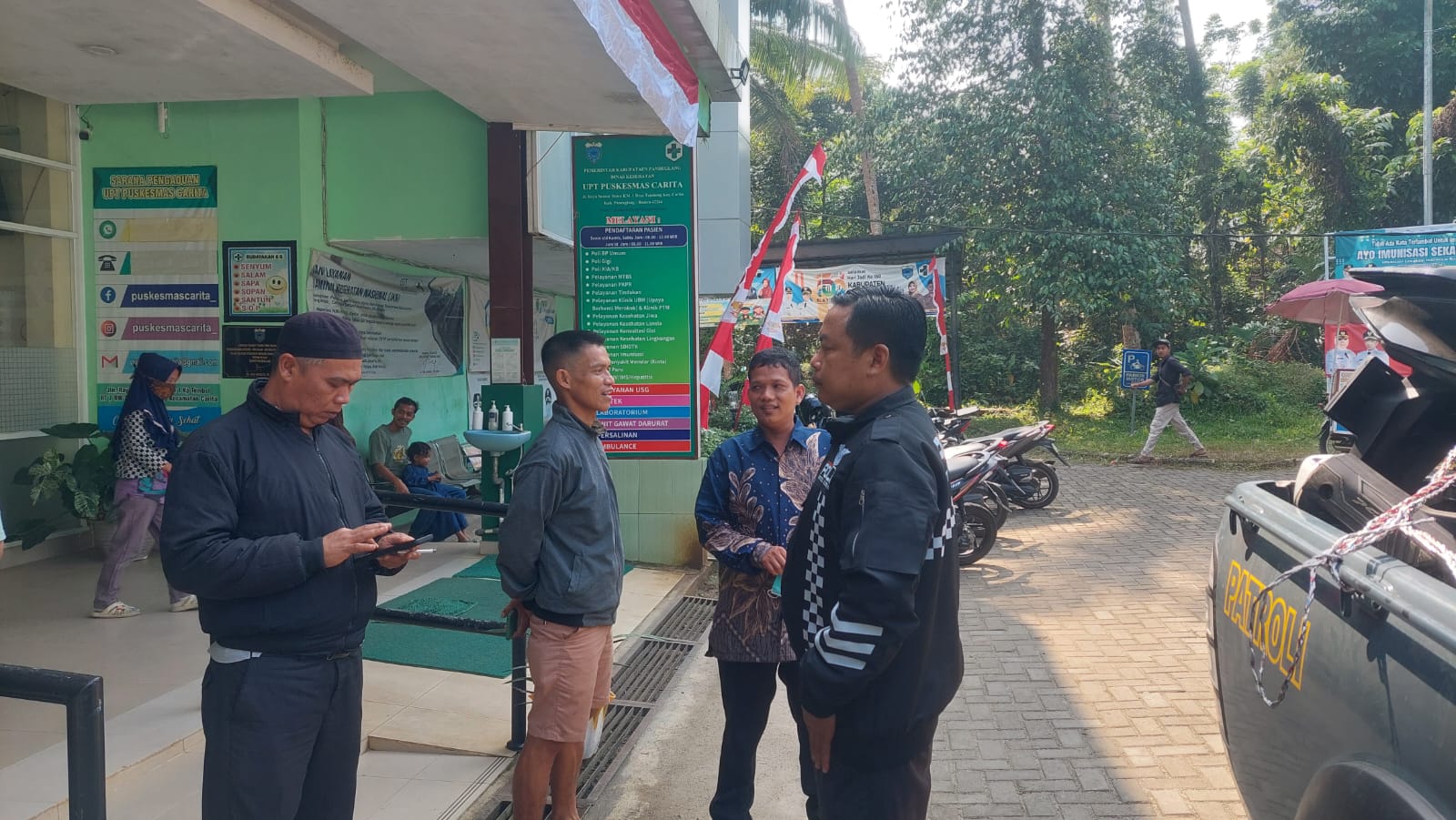Carita, 9 Agustus 2024 – Bripka Bobi dari Unit Lantas Polsek Carita Polres Pandeglang melaksanakan patroli siang hari ke Puskesmas Carita pada Jumat, 9 Agustus 2024. Kegiatan ini bertujuan untuk mengecek perkembangan situasi keamanan dan ketertiban masyarakat (kamtibmas) di lingkungan sekitar puskesmas.