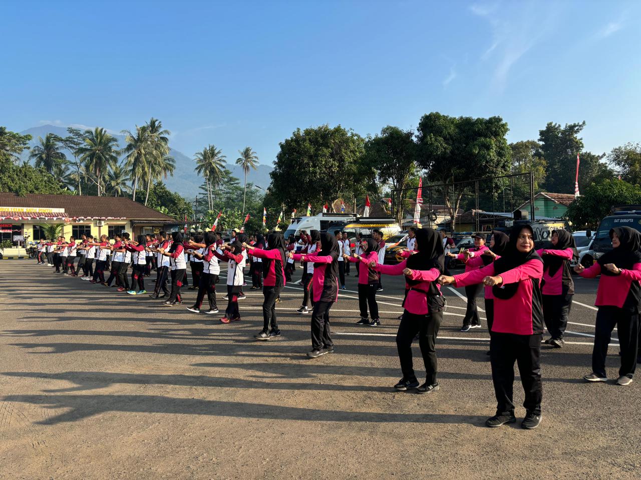 Ibu bhayangkari beserta anggota sipropam polres pandeglang melaksanakan senam berasama di lapangan polres pandeglang