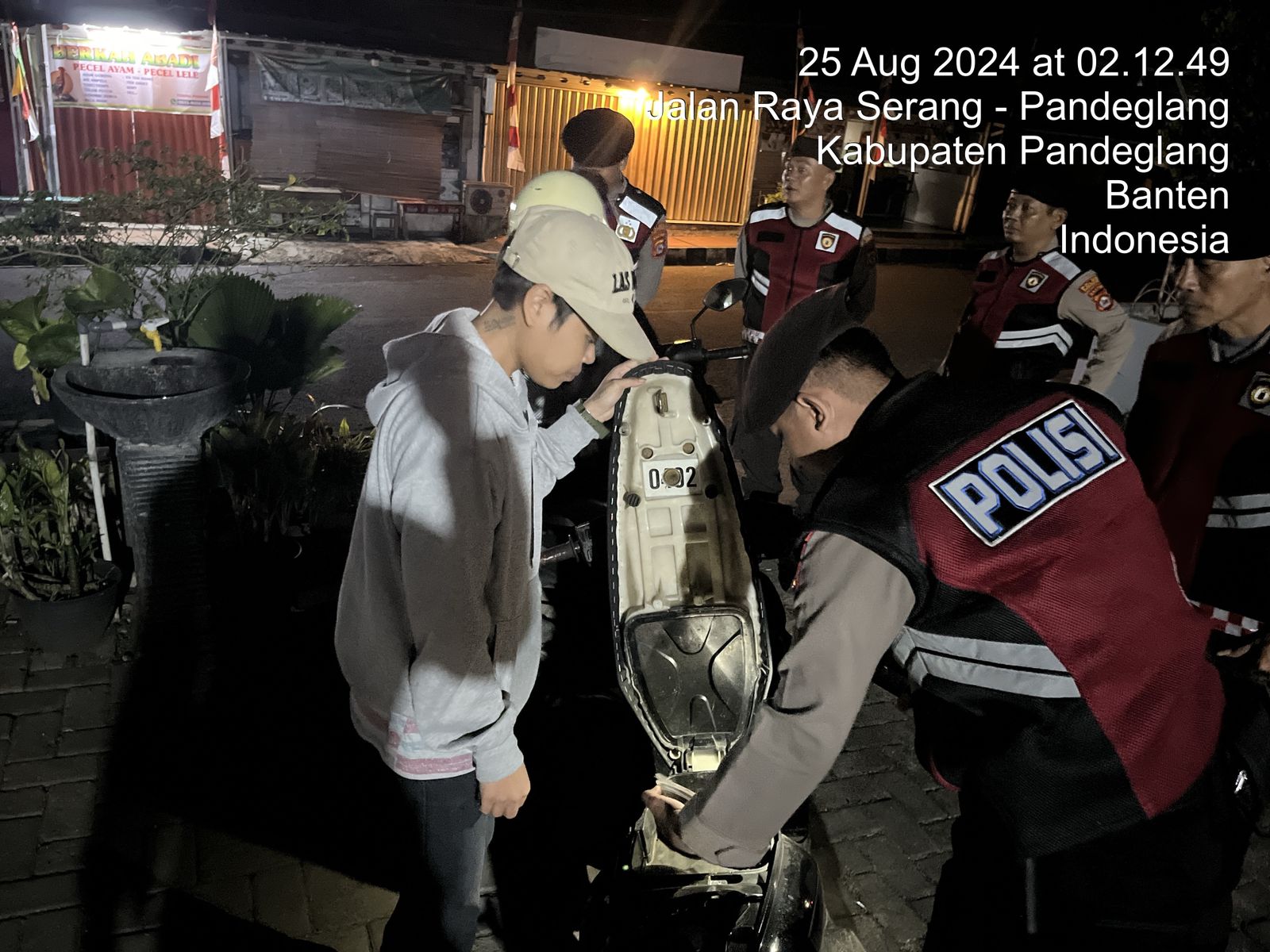 Pandeglang – Satuan Samapta Polres Pandeglang melaksanakan patroli malam pada Sabtu malam, 24 Agustus 2024, guna mencegah adanya aksi tawuran yang melibatkan remaja. Dalam kegiatan tersebut, petugas juga melakukan pemeriksaan terhadap bawaan jok motor remaja yang ditemui selama patroli.