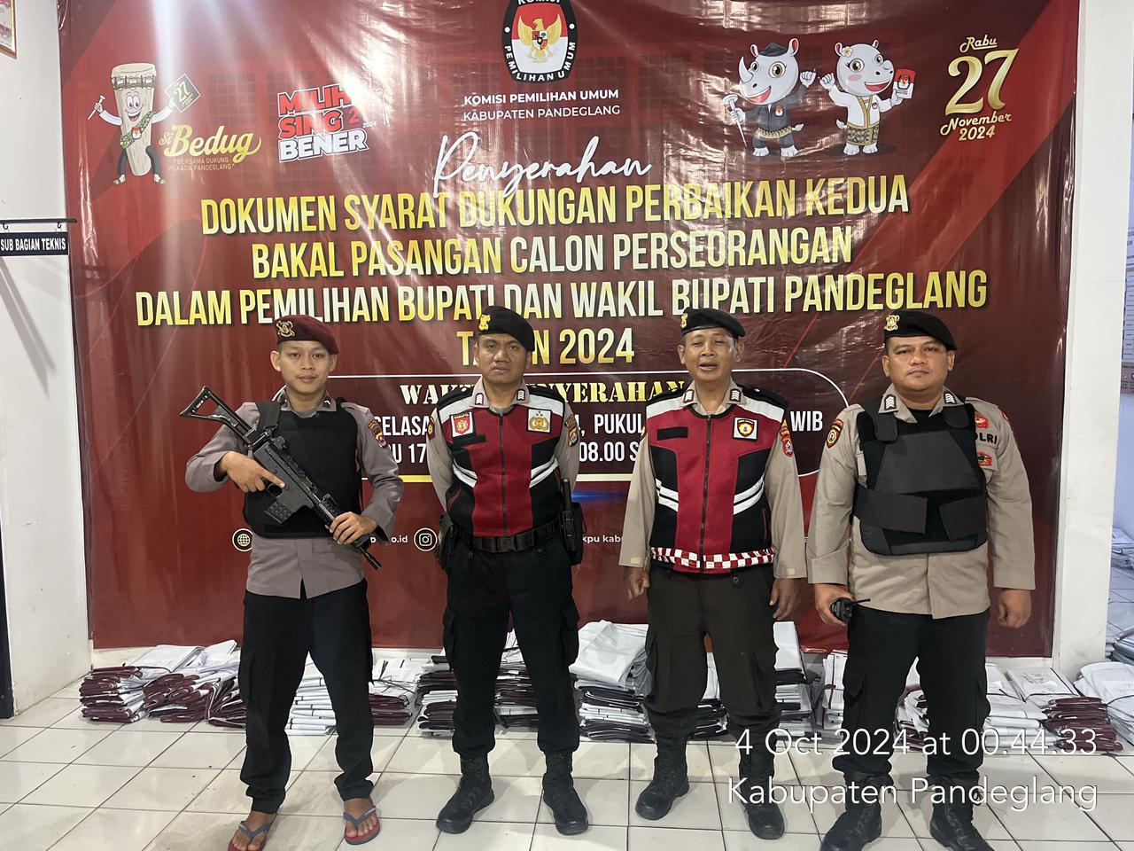 Pandeglang – Satuan Samapta (Sat Samapta) Polres Pandeglang telah meningkatkan kesiapsiagaan dengan menyiagakan personel selama 24 jam di Kantor Komisi Pemilihan Umum (KPU) Kabupaten Pandeglang pada Jumat, 4 Oktober 2024. Langkah ini diambil sebagai upaya untuk memastikan keamanan dan kelancaran selama tahapan Pemilihan Kepala Daerah (Pilkada) 2024.