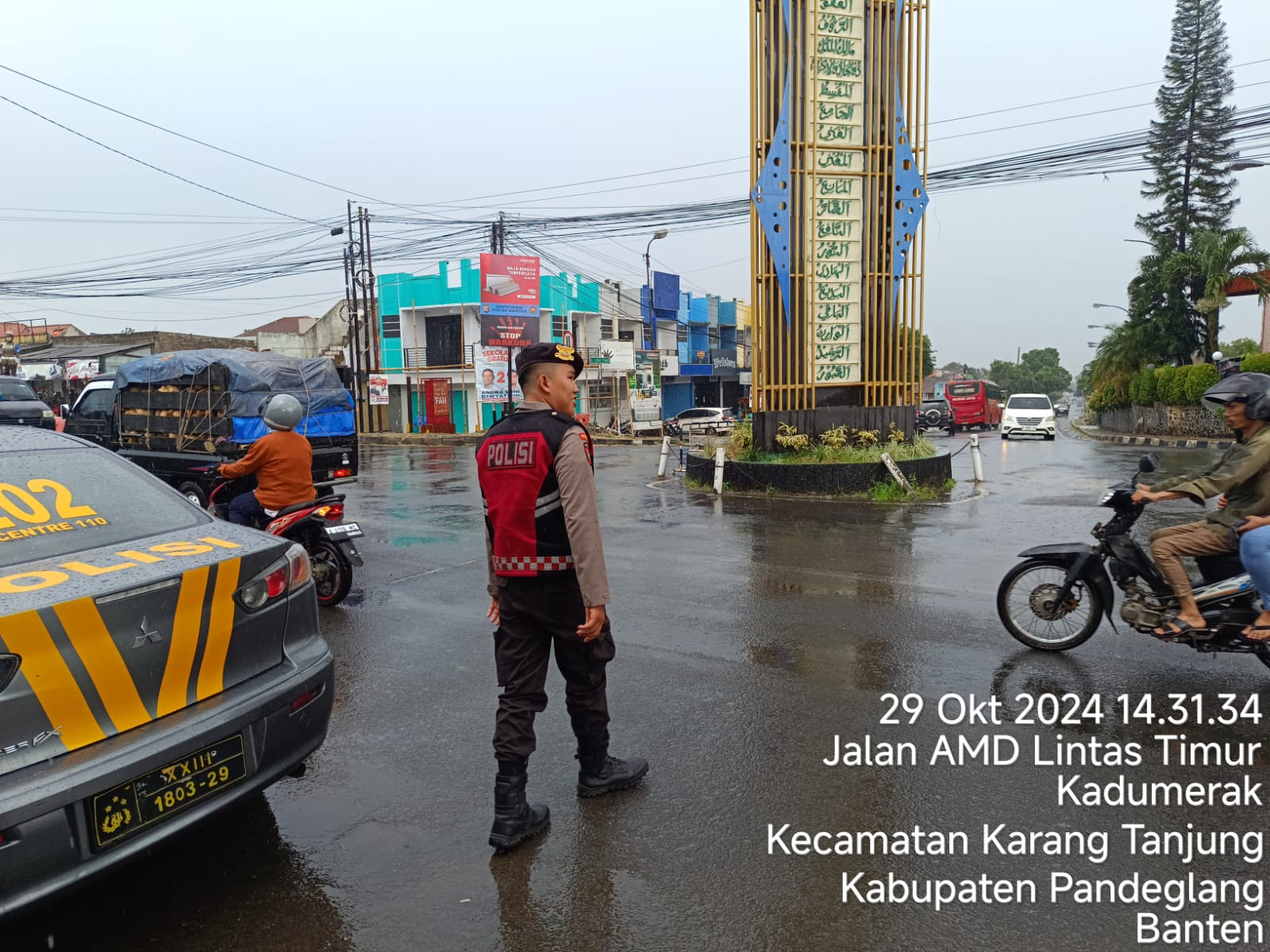 Pandeglang – Sat Samapta Polres Pandeglang melakukan pengaturan lalu lintas di wilayah Cigadung pada Selasa, 29 Oktober 2024, setelah hujan deras mengguyur area tersebut. Kegiatan ini bertujuan untuk memastikan kelancaran lalu lintas dan memberikan keamanan bagi pengguna jalan yang melintasi jalanan yang basah dan licin.