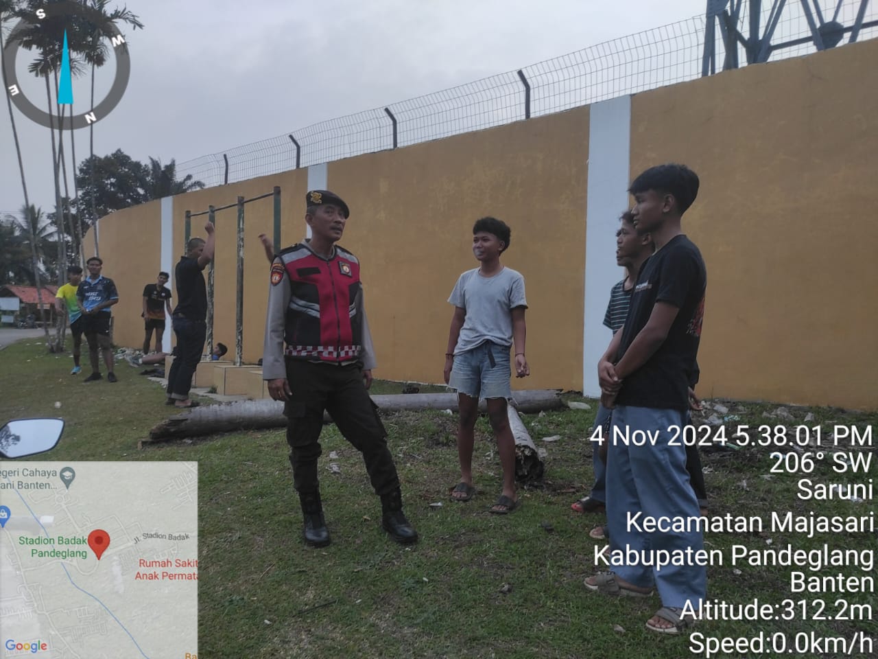 Pandeglang – Pada Senin, 4 November 2024, personil Sat Samapta Polres Pandeglang melaksanakan patroli dialogis di Stadion Badak Pandeglang. Kegiatan ini bertujuan untuk memberikan himbauan kamtibmas kepada remaja di sekitar stadion agar tidak terlibat dalam tindakan yang meresahkan masyarakat, seperti balap liar.
