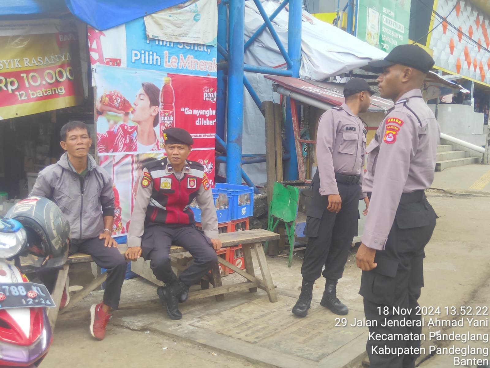 Pandeglang, 18 November 2024 – Sat Samapta Polres Pandeglang, bersama siswa Sekolah Polisi Negara (SPN) Mandalawangi, melaksanakan kegiatan sambang dialogis kepada para tukang ojek di kawasan Pasar Badak, pada Senin, 18 November 2024. Kegiatan ini bertujuan untuk memberikan edukasi mengenai keamanan dan ketertiban masyarakat (kamtibmas), sekaligus mempererat hubungan polisi dengan masyarakat.