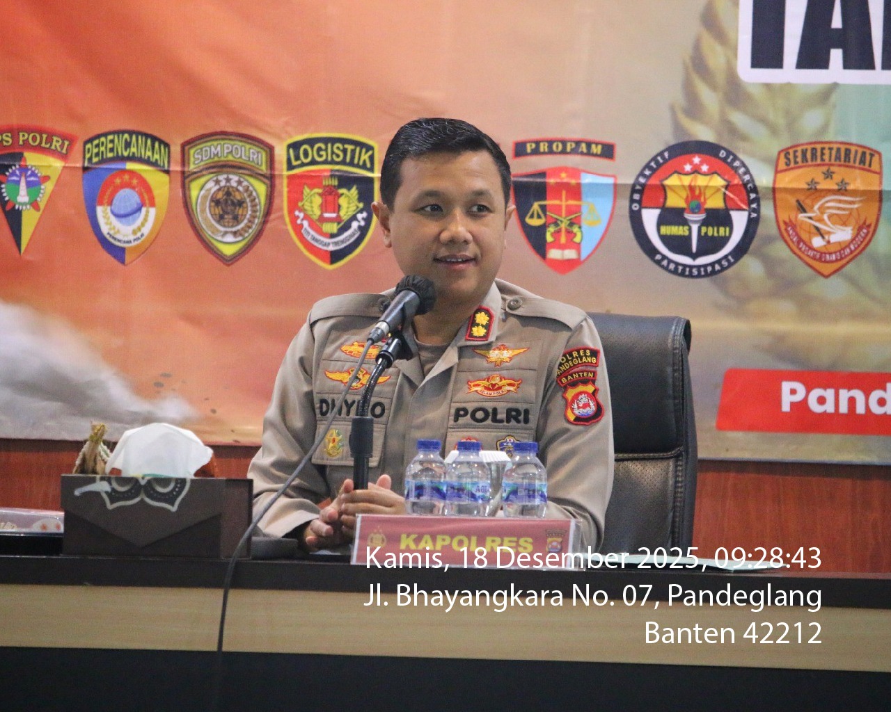 Pandeglang – Polres Pandeglang menggelar kegiatan sosialisasi terkait larangan bagi Personel Polri dan PNS Polri (PNPP) beserta keluarga untuk bergaya hidup hedon atau terlibat dalam kelompok yang dapat dipersepsikan bergaya hedon, Kamis (18/12/2025). Kegiatan tersebut dipimpin langsung oleh Kapolres Pandeglang AKBP Dr. Dhyno Indra Setyadi dan diikuti oleh seluruh personel Polres Pandeglang.