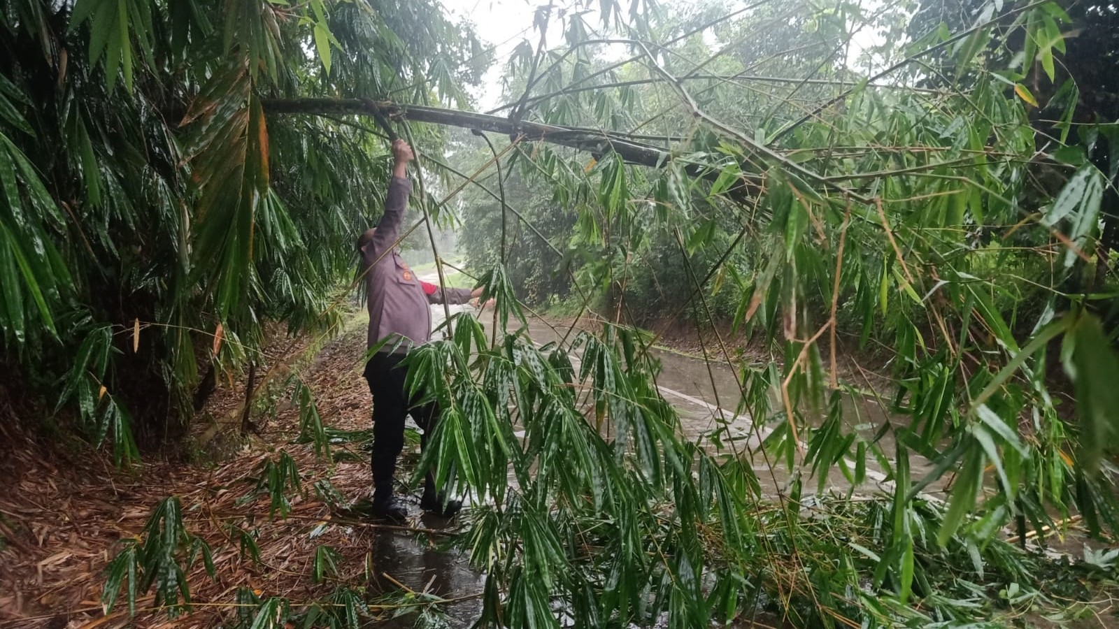 Pohon tumbang tersebut terjadi akibat curah hujan yang cukup tinggi disertai angin kencang, sehingga sebuah pohon berukuran besar roboh dan melintang di badan jalan. Kondisi ini menyebabkan arus lalu lintas terganggu serta berpotensi membahayakan pengguna jalan yang melintas di lokasi kejadian.