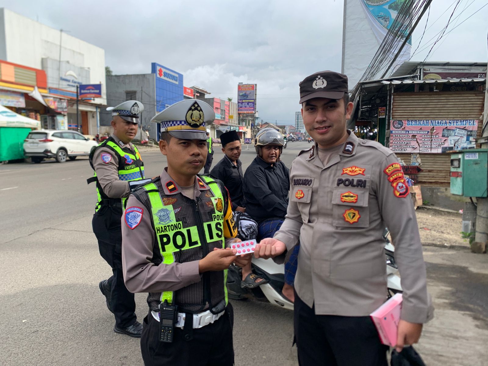 Pemberian vitamin dilakukan langsung oleh personel Sidokkes Polres Pandeglang kepada anggota yang bertugas. Terlihat Briptu Diki, personel Sidokkes Polres Pandeglang, memberikan vitamin kepada salah satu personel Operasi Keselamatan 2026 sebagai upaya menjaga daya tahan tubuh selama menjalankan tugas.