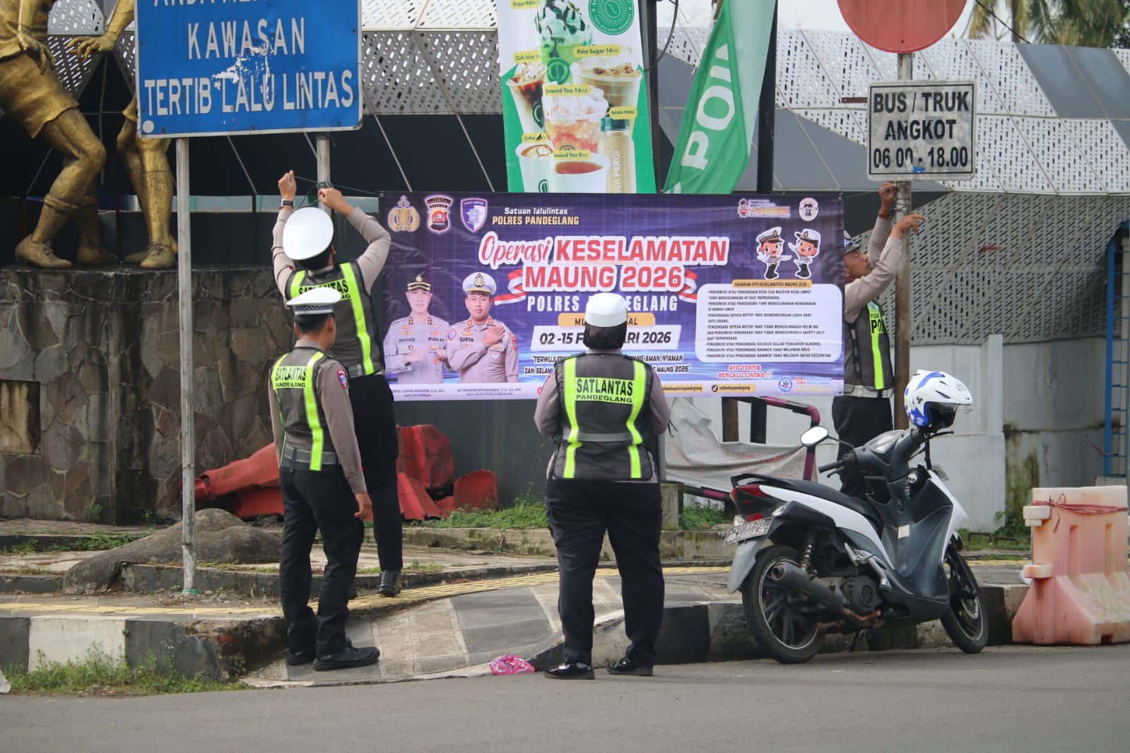 Pandeglang – Dalam rangka meningkatkan kesadaran dan kepatuhan masyarakat terhadap keselamatan berlalu lintas menjelang Hari Raya Idul Fitri 1447 H, Unit Keamanan dan Keselamatan (Kamsel) Satuan Lalu Lintas (Satlantas) Polres Pandeglang melaksanakan kegiatan pemasangan spanduk sosialisasi Operasi Keselamatan 2026, Kamis (05/02/2026).