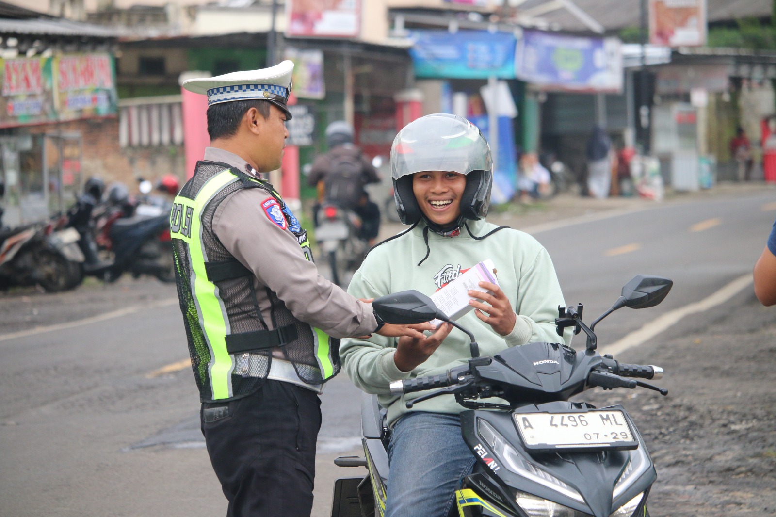 Apresiasi tersebut diberikan berupa tumbler sebagai bentuk penghargaan kepada pengendara yang telah mematuhi peraturan lalu lintas, seperti menggunakan helm SNI, melengkapi surat-surat kendaraan, serta mematuhi rambu dan marka jalan.