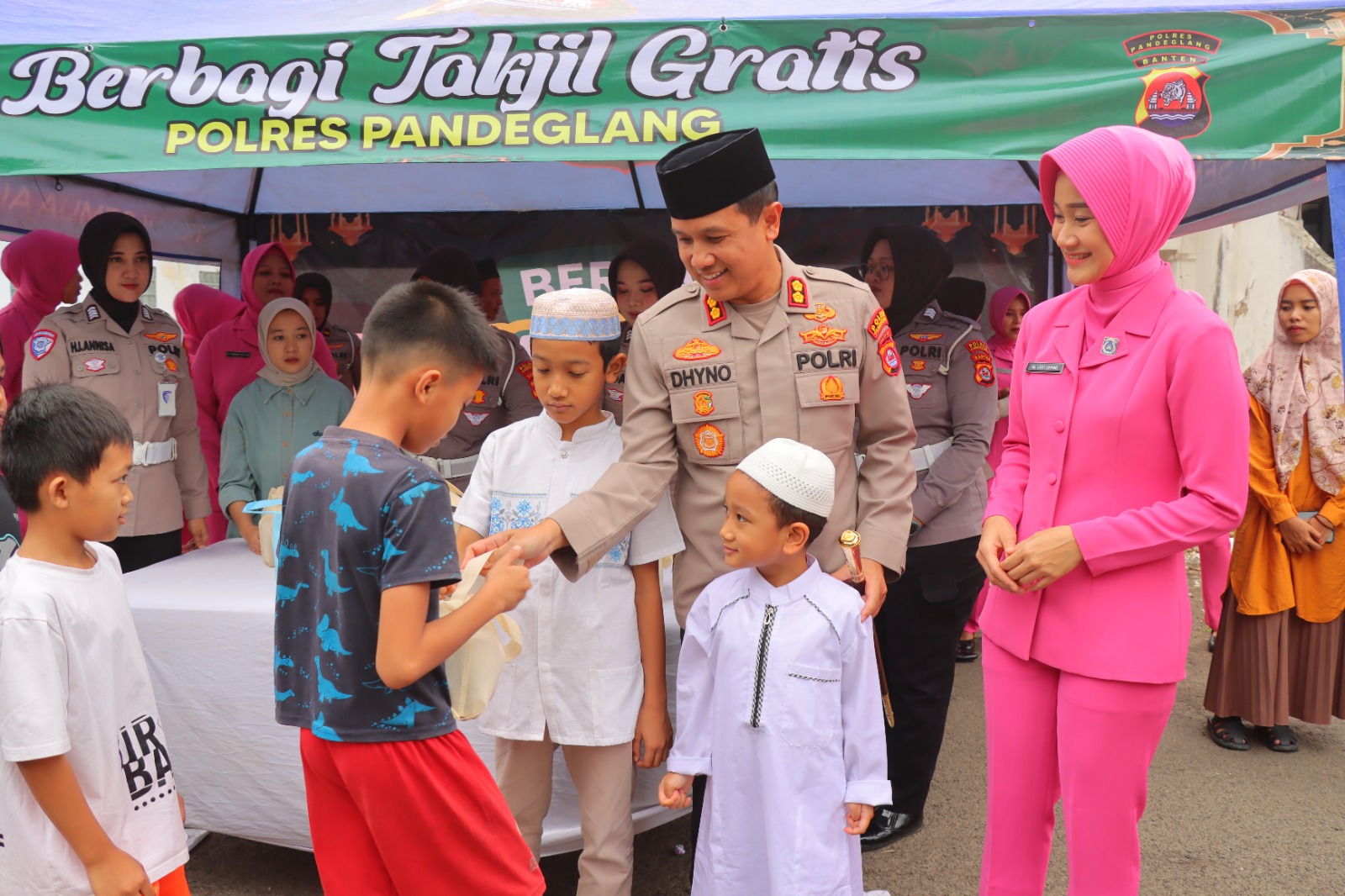 Kegiatan tersebut dipimpin langsung oleh Kapolres Pandeglang AKBP Dr. Dhyno Indra Setyadi bersama Ketua Bhayangkari Cabang Pandeglang Ny. Ledy Dhyno. Turut hadir dalam kegiatan tersebut para Pejabat Utama (PJU) Polres Pandeglang, personel Polres, serta pengurus Bhayangkari Cabang Pandeglang yang bersama-sama turun langsung membagikan paket takjil kepada para pengendara roda dua, roda empat, hingga pejalan kaki yang melintas.