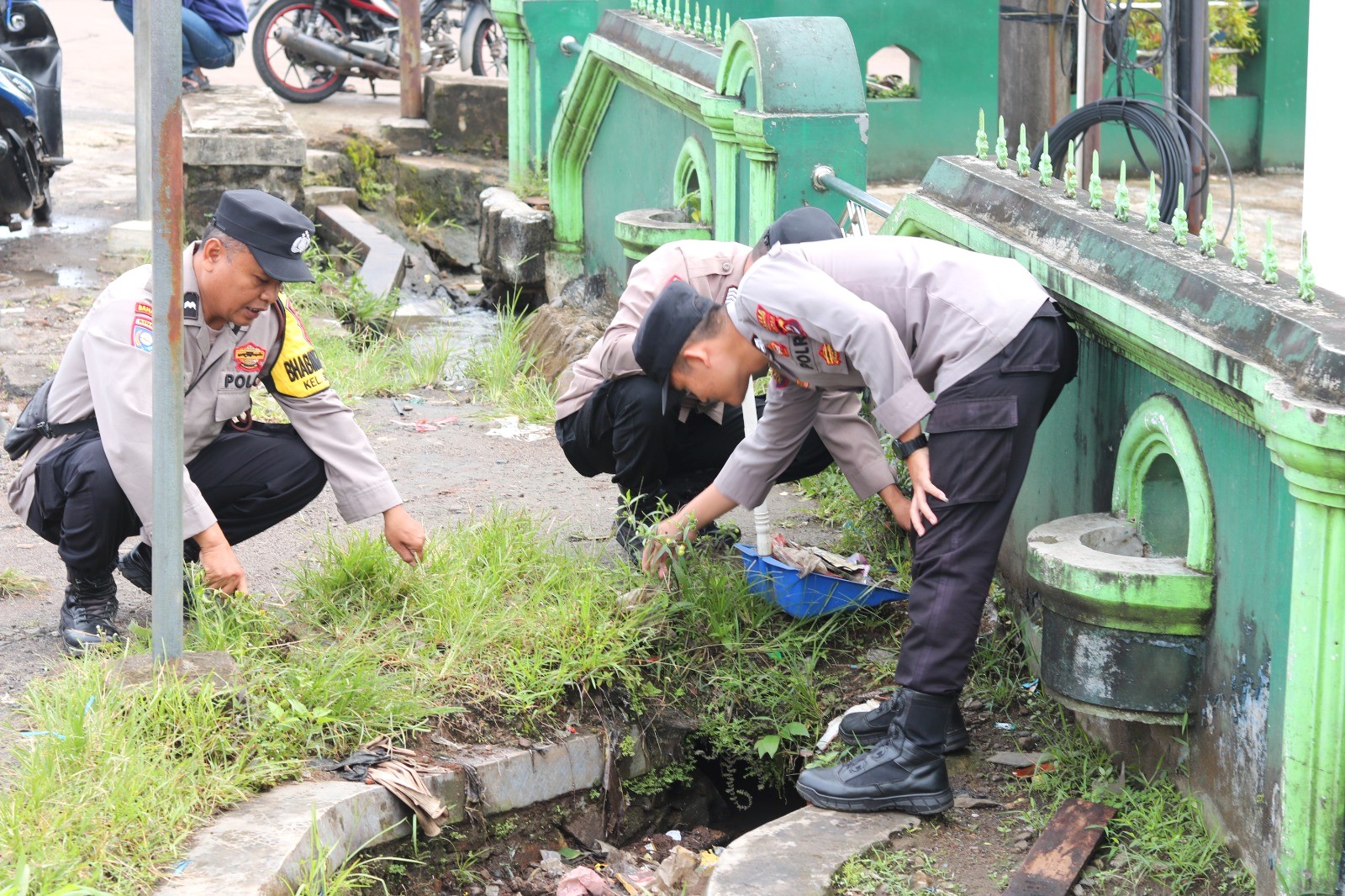 Sejak pagi hari, personel kepolisian bersama warga tampak bergotong royong membersihkan berbagai area seperti halaman masjid, ruang utama tempat ibadah, tempat wudhu, kamar mandi, saluran air hingga lingkungan sekitar sarana umum. Selain itu, petugas juga melakukan pembersihan sampah serta merapikan area sekitar agar terlihat bersih, rapi, dan nyaman digunakan oleh masyarakat.